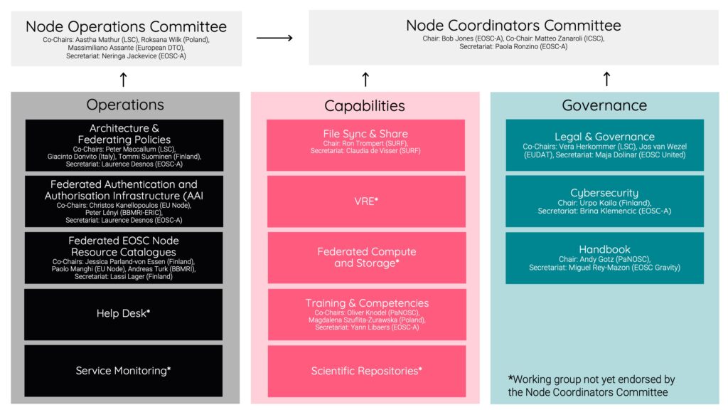 The EOSC Node Coordinators Committee (NCC) and EOSC Node Operations Committee (NOC), together with the EOSC Federation working groups, represent an interim governance structure designed to bridge the Federation from prototype to production by the end of the year.